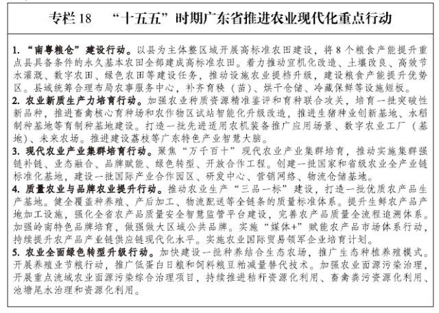 保障粮食安全。严格落实耕地保护和粮食安全责任制。实施耕地质量保护与提升工程,加强粮食生产技术攻关。加强粮食购销和储备管理,保持地方政府粮食储备规模相对稳定,优化储备品种结构和区域布局,抓好粮食市场化收购和产销合作,拓展多元化粮食进口渠道。加强粤港澳大湾区和重点城市粮食应急保障中心建设,建立健全粮食紧急疏运机制、异地储备应急调运机制。优化调整粮食储备仓储设施布局,提升绿色储粮水平,全面推进仓储管理现代化。持续推动“3+5”粮食物流核心枢纽和关键节点(“3”为广州、深圳、东莞3个核心枢纽承载城市,“5”为汕头、佛山、湛江、茂名、肇庆5个关键节点城市。)建设,有效提升应急分拨集散和通道衔接能力。培育大型骨干粮食企业,形成链主引领、配套完善的粮食产业体系。推进粮食全链条节约减损。加强粮食流通监管体系建设,建立监管新模式。
