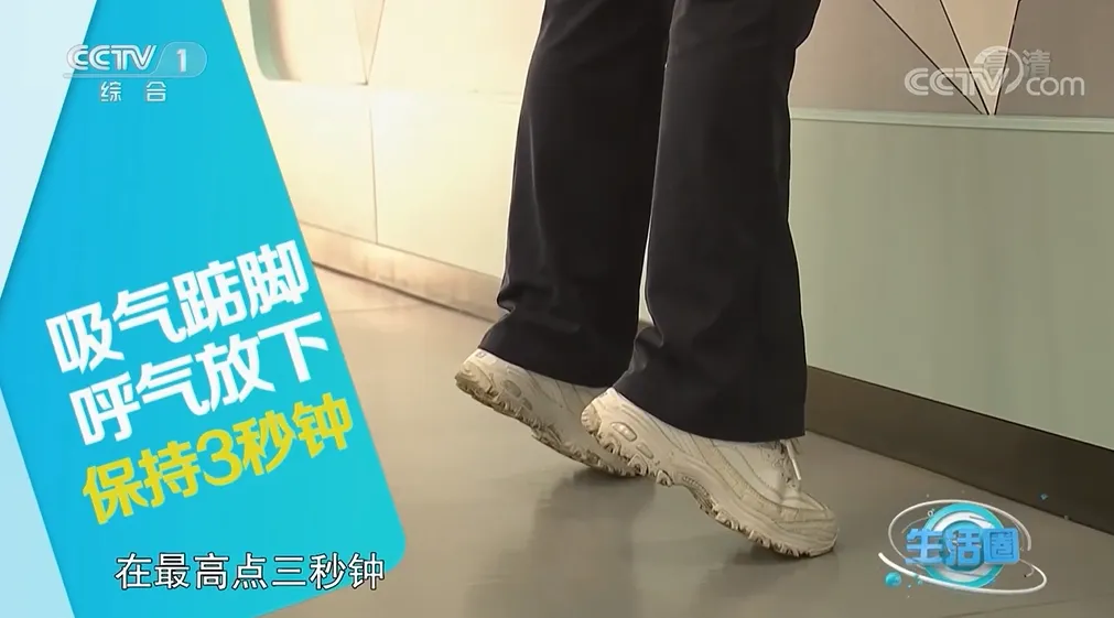 向上提踵时,两腿自然分开,吸气踮脚,保持3秒钟,呼气放下。