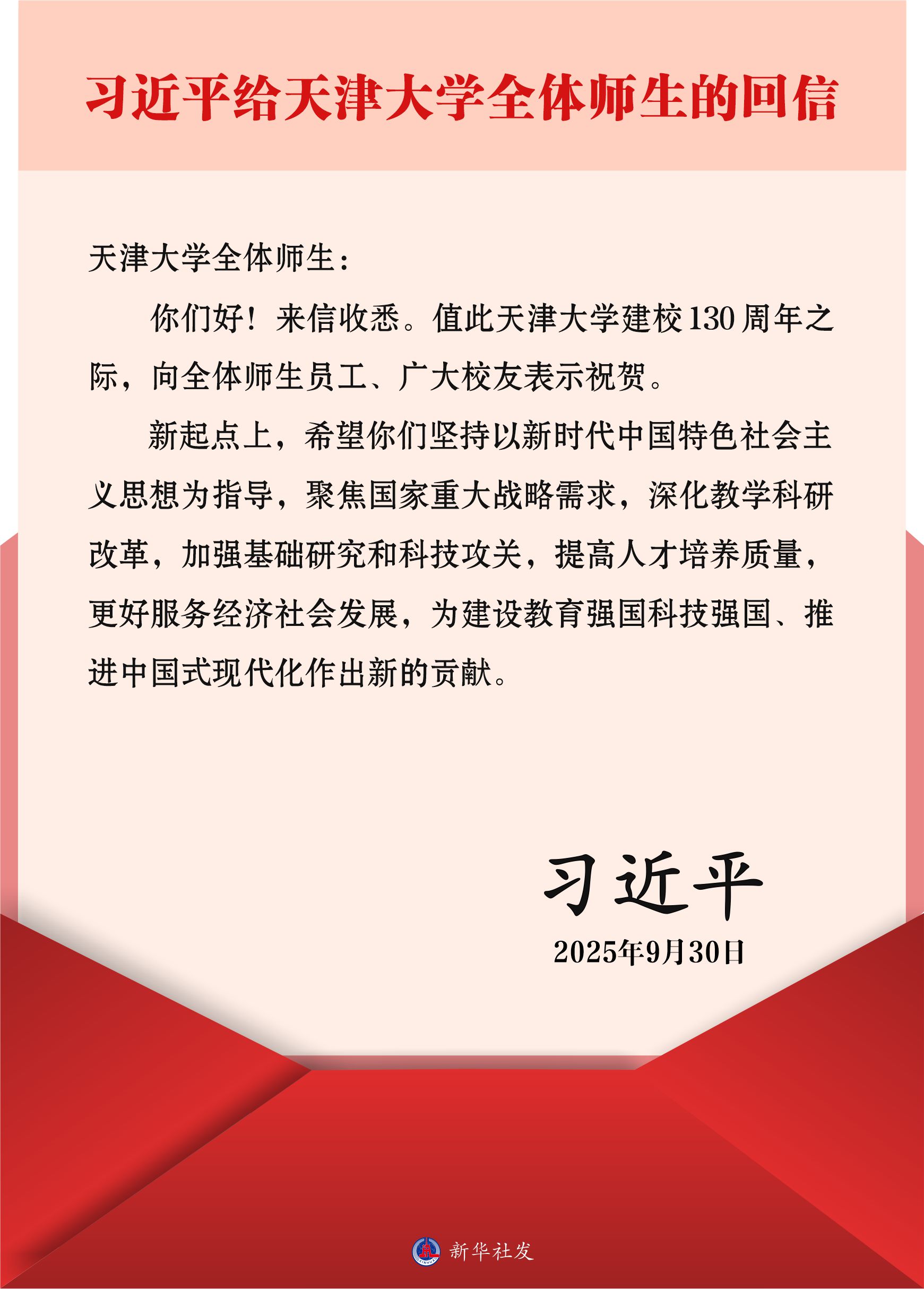你们好!来信收悉。值此天津大学建校130周年之际,向全体师生员工、广大校友表示祝贺。