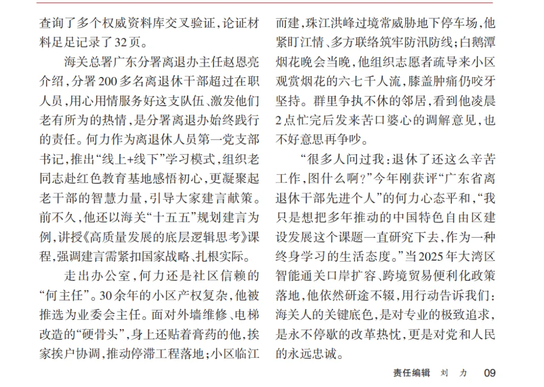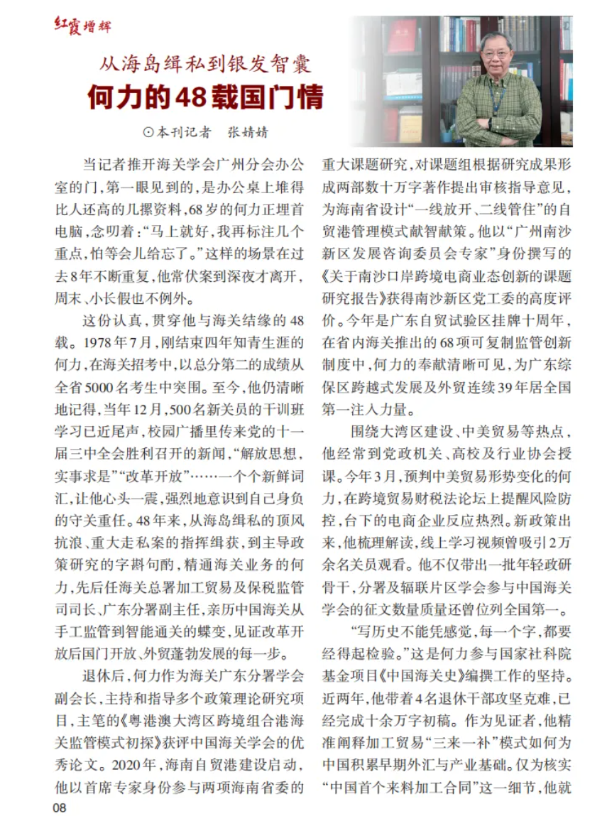 “很多人问过我:退休了还这么辛苦工作,图什么啊?”今年刚获评“广东省离退休干部先进个人”的何力心态平和,“我只是想把多年推动的中国特色自由区建设发展这个课题一直研究下去,作为一种终身学习的生活态度。”当2025年大湾区智能通关口岸扩容、跨境贸易便利化政策落地,他依然研途不辍,用行动告诉我们:海关人的关键底色,是对专业的极致追求,是永不停歇的改革热忱,更是对党和人民的永远忠诚。